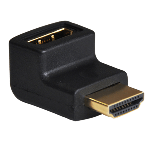Adaptateur HDMI qui permet de joindre deux fils de type A mâle à une extrémité et femelle à l'autre. La position en forme de L permet la connexion de câbles HDMI dans des endroits avec un espace limité ou une connexion difficile.