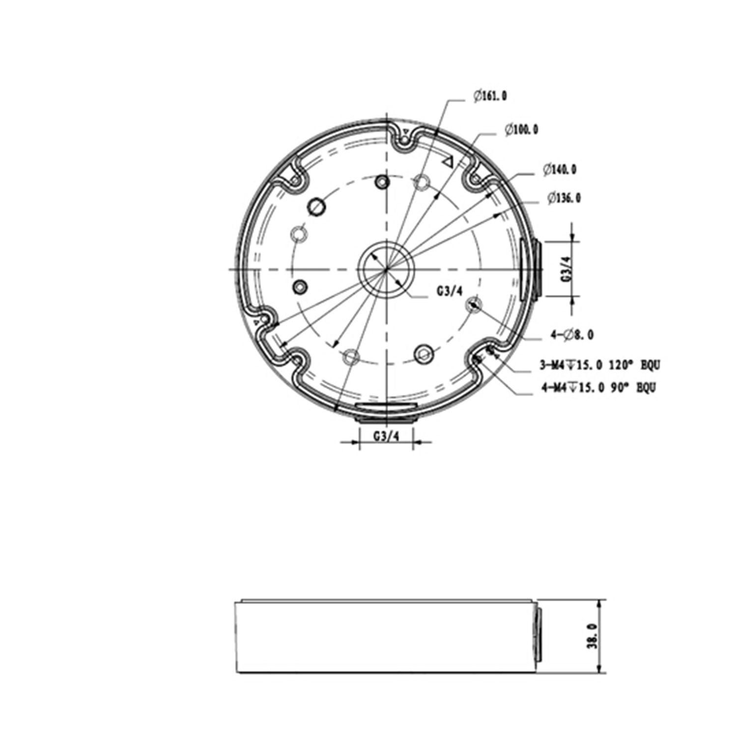 Permet d'y mettre l'alimentation, les câbles et les accessoires d'installation. Il a plusieurs trous pour l'installation de différents types de caméras dômes. Fixation au mur ou au plafond par 4 vis incluses. La caméra est installée dans le couvercle amovible du support. Il permet le passage du câblage interne.