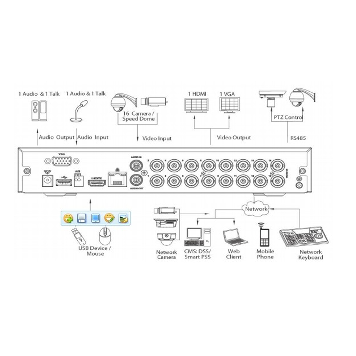 Facile à utiliser grâce à l'interface graphique intuitive, fournie avec une souris USB. Sauvegarde externe via des périphériques USB (mémoire, disque dur ou enregistreur) et via Ethernet. Avec une connexion réseau RJ45 qui permet un accès à distance via un navigateur Internet (ActiveX), un logiciel PSS ou via une application pour smartphone. Prend en charge le double flux, qui donne un accès rapide et fluide à Internet. Prend en charge le DDNS, ce qui permettra un accès à distance facile même avec une IP dynamique.